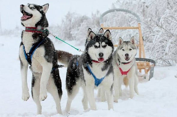 Sleeën met husky's ervoor